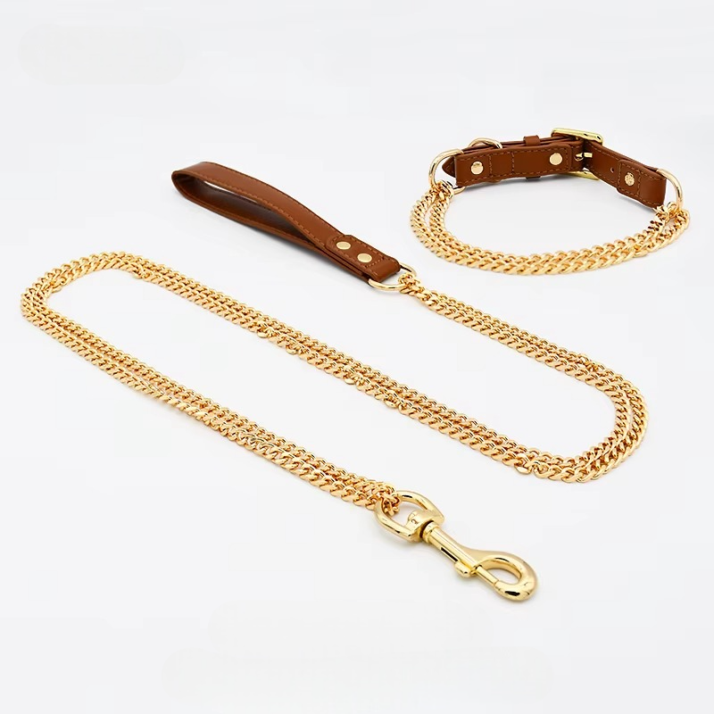 Where luxury meets attitude, the mix of genuine leather and golden chain gives your dog a stylish, eye-catching presence.